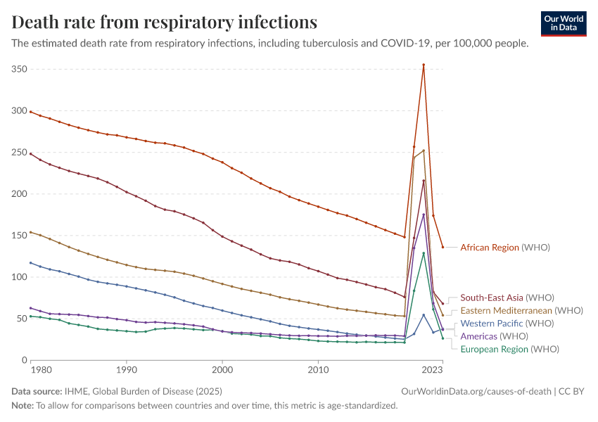 IHME, Global Burden of Disease (2025) – with major processing by Our World in Data. “Death rate from respiratory infections” [dataset]. IHME, Global Burden of Disease, “Global Burden of Disease - Deaths” [original data]. Retrieved March 12, 2026 from https://bespoke-income-plots.owid.pages.dev/grapher/death-rate-from-respiratory-infections