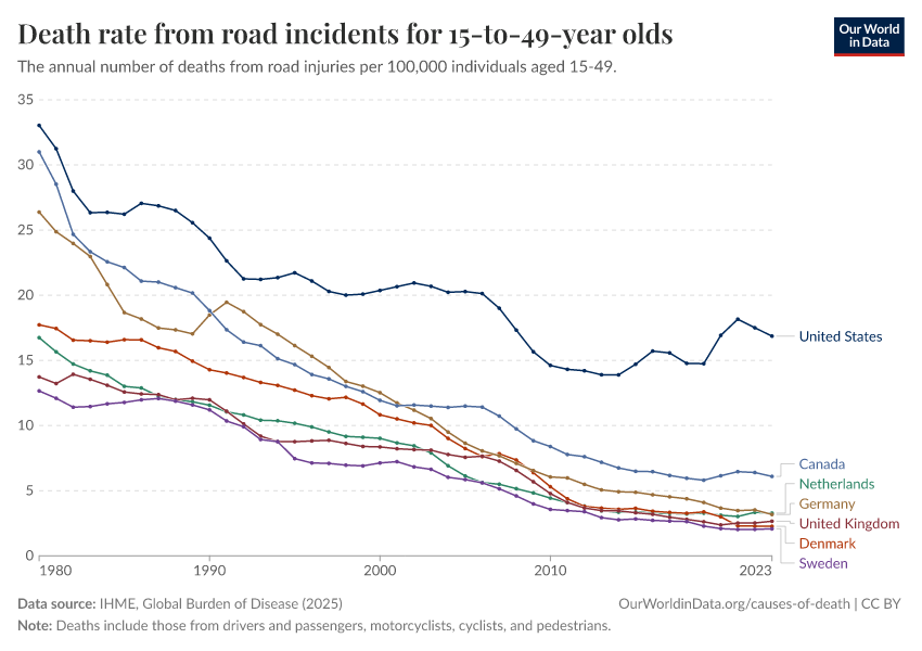 IHME, Global Burden of Disease (2025) – with major processing by Our World in Data. “Death rate from road incidents for 15-to-49-year olds” [dataset]. IHME, Global Burden of Disease, “Global Burden of Disease - Deaths” [original data]. Retrieved March 12, 2026 from https://bespoke-income-plots.owid.pages.dev/grapher/death-rate-from-road-accidents-for-15--to-49-year-olds