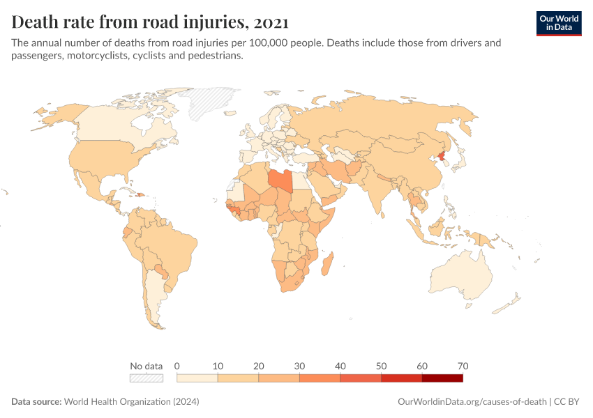 “Data Page: Death rate from road injuries”, part of the following publication: Esteban Ortiz-Ospina and Max Roser (2016) - “Global Health”. Data adapted from World Health Organization. Retrieved from https://bespoke-income-plots.owid.pages.dev/grapher/death-rate-from-road-accidents-ghe [online resource]How to cite this data