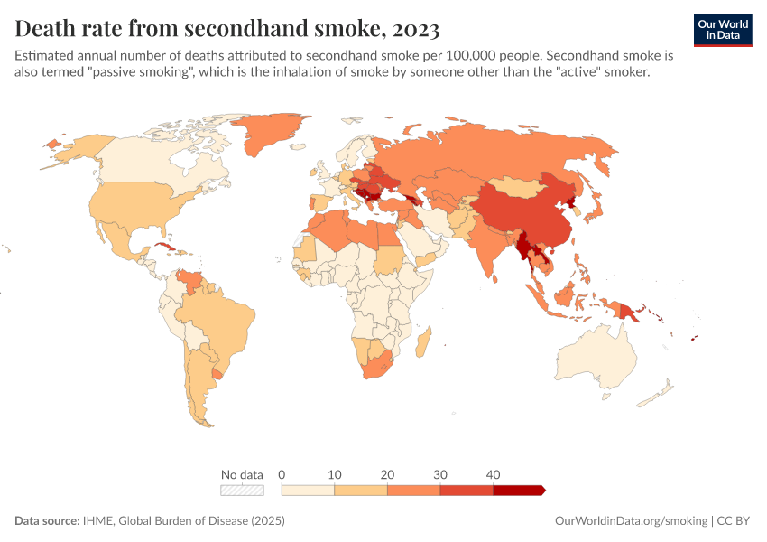 “Data Page: Death rate from secondhand smoke”, part of the following publication: Esteban Ortiz-Ospina and Max Roser (2016) - “Global Health”. Data adapted from IHME, Global Burden of Disease. Retrieved from https://bespoke-income-plots.owid.pages.dev/grapher/death-rate-from-secondhand-smoke-gbd [online resource]How to cite this data