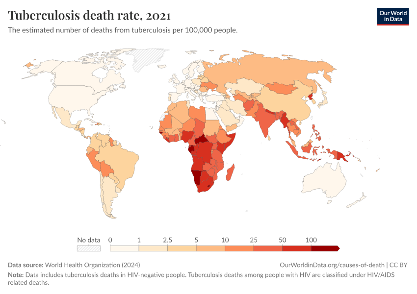 “Data Page: Tuberculosis death rate”, part of the following publication: Esteban Ortiz-Ospina and Max Roser (2016) - “Global Health”. Data adapted from World Health Organization. Retrieved from https://bespoke-income-plots.owid.pages.dev/grapher/death-rate-from-tuberculosis-ghe [online resource]How to cite this data