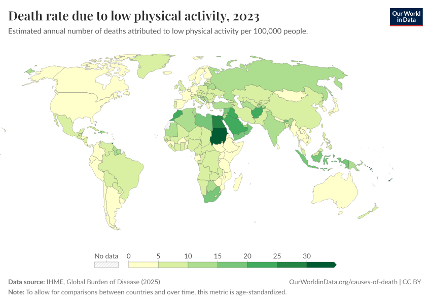 “Data Page: Death rate due to low physical activity”, part of the following publication: Esteban Ortiz-Ospina and Max Roser (2016) - “Global Health”. Data adapted from IHME, Global Burden of Disease. Retrieved from https://bespoke-income-plots.owid.pages.dev/grapher/death-rates-due-to-low-physical-activity [online resource]How to cite this data