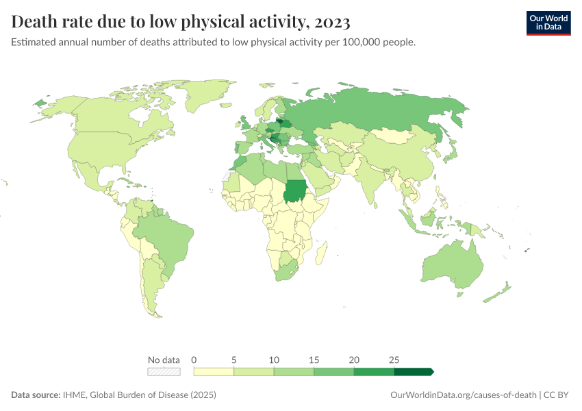 “Data Page: Death rate due to low physical activity”, part of the following publication: Esteban Ortiz-Ospina and Max Roser (2016) - “Global Health”. Data adapted from IHME, Global Burden of Disease. Retrieved from https://bespoke-income-plots.owid.pages.dev/grapher/death-rates-due-to-low-physical-activity-gbd [online resource]How to cite this data