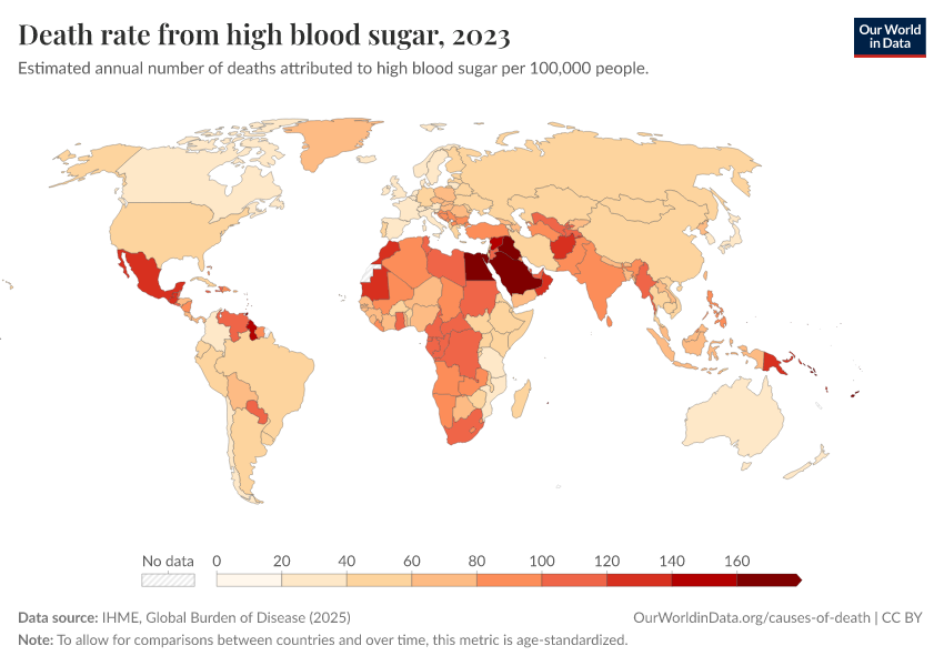 IHME, Global Burden of Disease (2025) – with major processing by Our World in Data. “Death rate from high blood sugar” [dataset]. IHME, Global Burden of Disease, “Global Burden of Disease - Risk Factors - Deaths” [original data]. Retrieved March 12, 2026 from https://bespoke-income-plots.owid.pages.dev/grapher/death-rates-from-high-blood-sugar