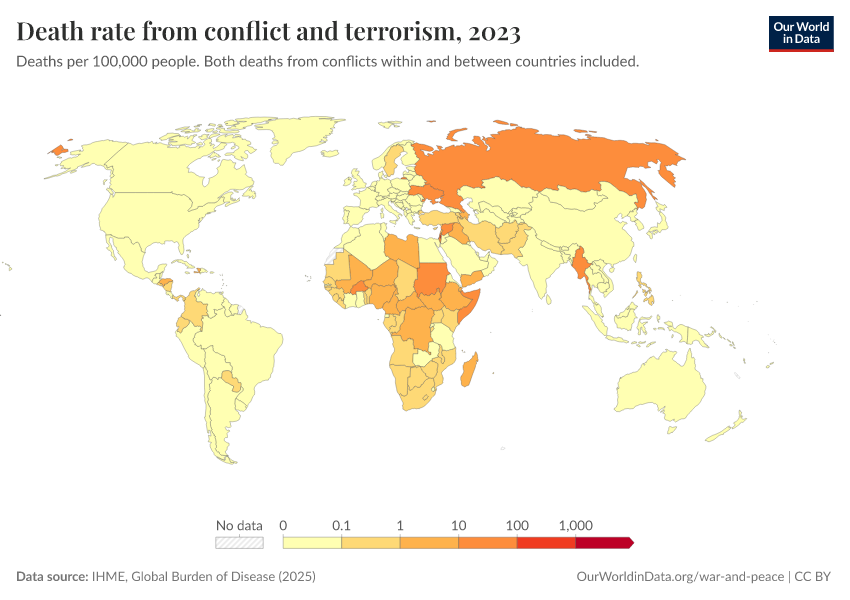 “Data Page: Death rate from conflict and terrorism”, part of the following publication: Esteban Ortiz-Ospina and Max Roser (2016) - “Global Health”. Data adapted from IHME, Global Burden of Disease. Retrieved from https://bespoke-income-plots.owid.pages.dev/grapher/deaths-conflict-terrorism-per-100000 [online resource]How to cite this data