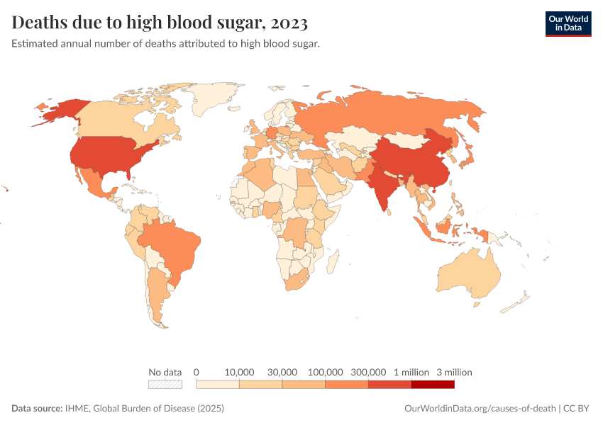 “Data Page: Deaths due to high blood sugar”, part of the following publication: Esteban Ortiz-Ospina and Max Roser (2016) - “Global Health”. Data adapted from IHME, Global Burden of Disease. Retrieved from https://bespoke-income-plots.owid.pages.dev/grapher/deaths-due-to-high-blood-sugar [online resource]How to cite this data