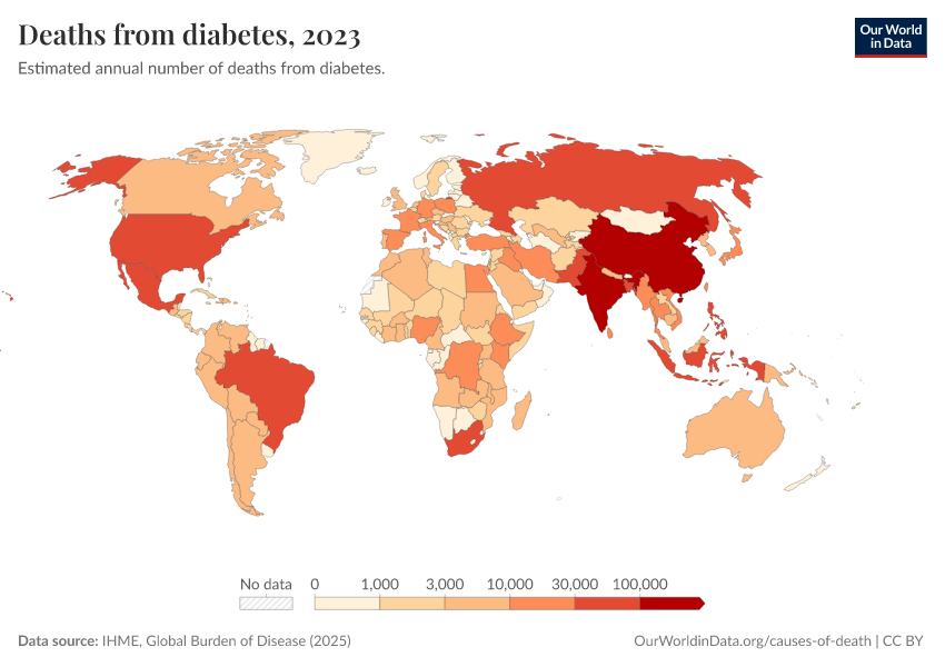 “Data Page: Deaths from diabetes”, part of the following publication: Esteban Ortiz-Ospina and Max Roser (2016) - “Global Health”. Data adapted from IHME, Global Burden of Disease. Retrieved from https://bespoke-income-plots.owid.pages.dev/grapher/deaths-from-diabetes [online resource]How to cite this data