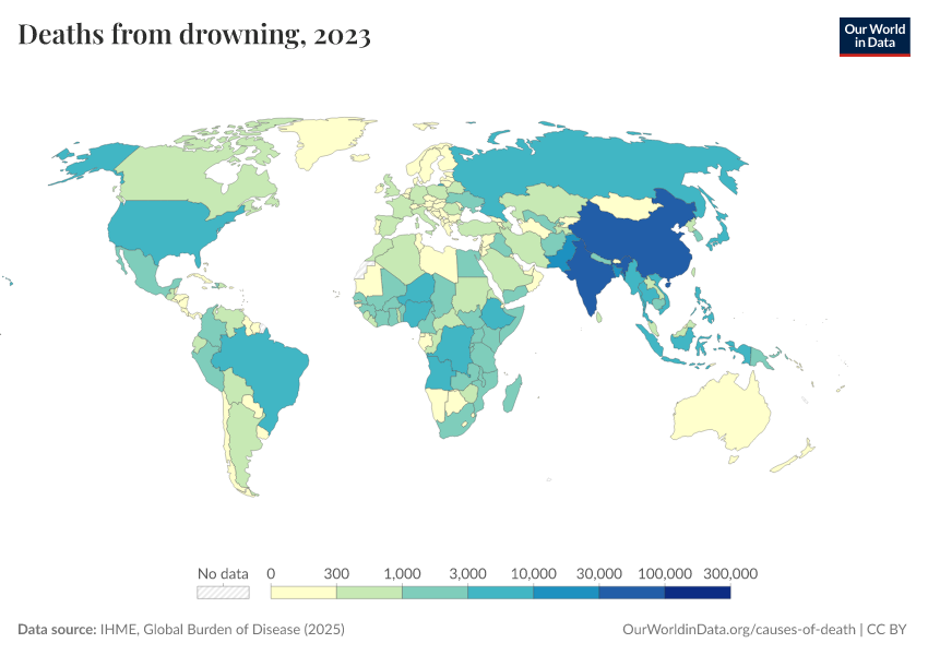 IHME, Global Burden of Disease (2025) – with major processing by Our World in Data. “Deaths from drowning” [dataset]. IHME, Global Burden of Disease, “Global Burden of Disease - Deaths” [original data]. Retrieved March 12, 2026 from https://bespoke-income-plots.owid.pages.dev/grapher/deaths-from-drowning