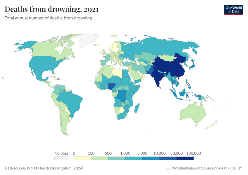 World Health Organization (2024) – with major processing by Our World in Data. “Deaths from drowning” [dataset]. World Health Organization, “Global Health Estimates” [original data]. Retrieved March 12, 2026 from https://bespoke-income-plots.owid.pages.dev/grapher/deaths-from-drowning-ghe