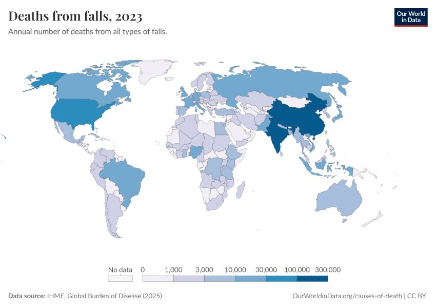 IHME, Global Burden of Disease (2025) – with major processing by Our World in Data. “Deaths from falls” [dataset]. IHME, Global Burden of Disease, “Global Burden of Disease - Deaths” [original data]. Retrieved March 12, 2026 from https://bespoke-income-plots.owid.pages.dev/grapher/deaths-from-falls-gbd