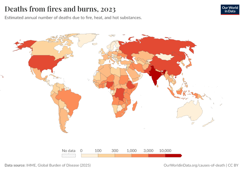 “Data Page: Deaths from fires and burns”, part of the following publication: Esteban Ortiz-Ospina and Max Roser (2016) - “Global Health”. Data adapted from IHME, Global Burden of Disease. Retrieved from https://bespoke-income-plots.owid.pages.dev/grapher/deaths-from-fires-and-burns [online resource]How to cite this data
