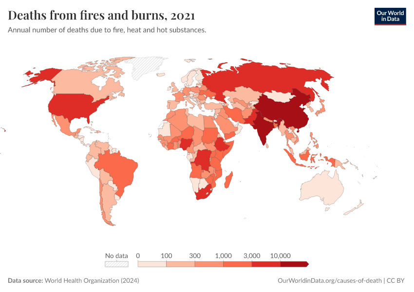 “Data Page: Deaths from fires and burns”, part of the following publication: Esteban Ortiz-Ospina and Max Roser (2016) - “Global Health”. Data adapted from World Health Organization. Retrieved from https://bespoke-income-plots.owid.pages.dev/grapher/deaths-from-fires-and-burns-who [online resource]How to cite this data