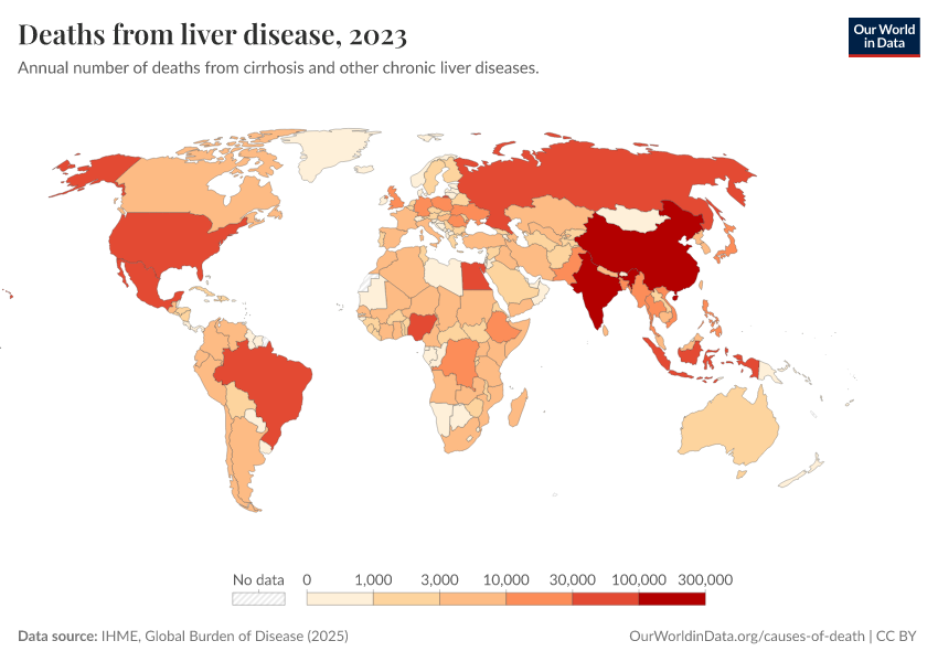 IHME, Global Burden of Disease (2025) – with major processing by Our World in Data. “Deaths from liver disease” [dataset]. IHME, Global Burden of Disease, “Global Burden of Disease - Deaths” [original data]. Retrieved March 12, 2026 from https://bespoke-income-plots.owid.pages.dev/grapher/deaths-from-liver-disease