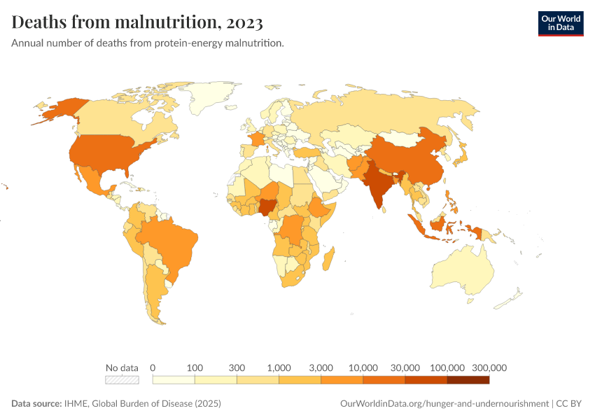 IHME, Global Burden of Disease (2025) – with major processing by Our World in Data. “Deaths from malnutrition” [dataset]. IHME, Global Burden of Disease, “Global Burden of Disease - Deaths” [original data]. Retrieved March 12, 2026 from https://bespoke-income-plots.owid.pages.dev/grapher/deaths-from-malnutrition
