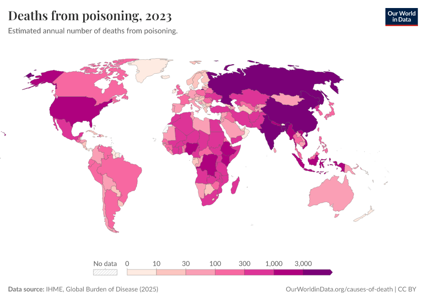 “Data Page: Deaths from poisoning”, part of the following publication: Esteban Ortiz-Ospina and Max Roser (2016) - “Global Health”. Data adapted from IHME, Global Burden of Disease. Retrieved from https://bespoke-income-plots.owid.pages.dev/grapher/deaths-from-poisoning [online resource]How to cite this data