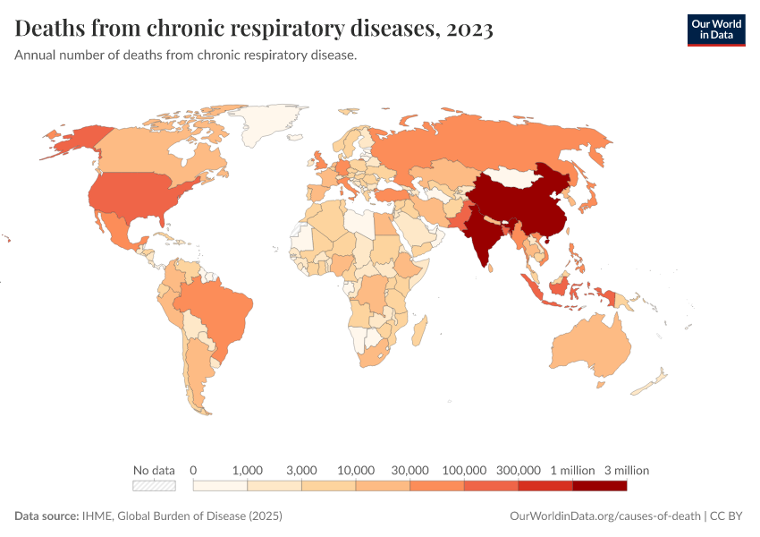 IHME, Global Burden of Disease (2025) – with major processing by Our World in Data. “Deaths from chronic respiratory diseases” [dataset]. IHME, Global Burden of Disease, “Global Burden of Disease - Deaths” [original data]. Retrieved March 12, 2026 from https://bespoke-income-plots.owid.pages.dev/grapher/deaths-from-respiratory-disease
