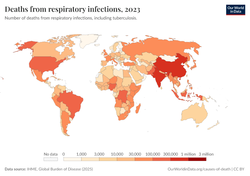 IHME, Global Burden of Disease (2025) – with major processing by Our World in Data. “Deaths from respiratory infections” [dataset]. IHME, Global Burden of Disease, “Global Burden of Disease - Deaths” [original data]. Retrieved March 12, 2026 from https://bespoke-income-plots.owid.pages.dev/grapher/deaths-from-respiratory-infections
