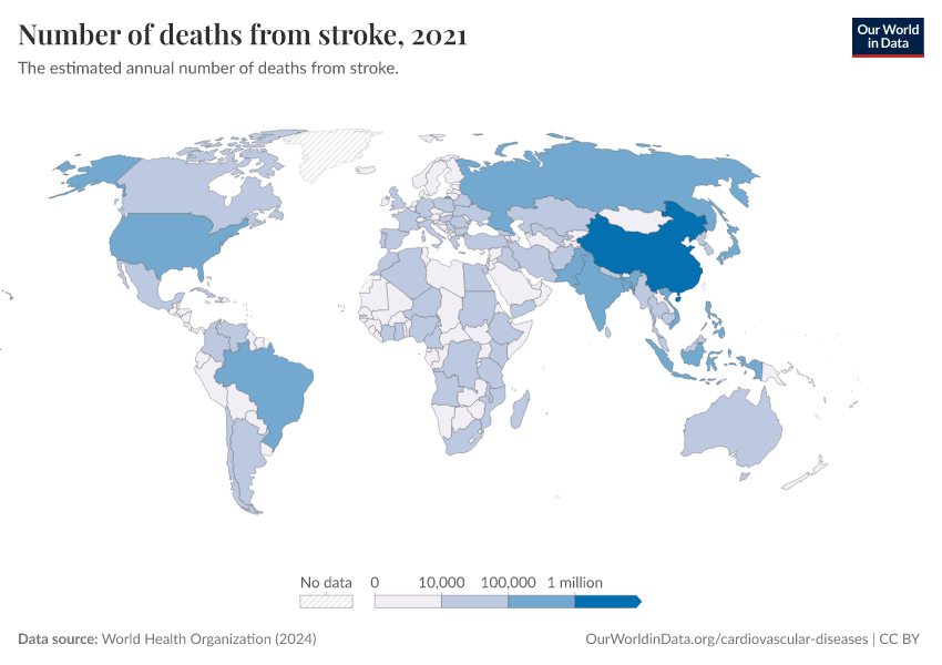 World Health Organization (2024) – with major processing by Our World in Data. “Number of deaths from stroke” [dataset]. World Health Organization, “Global Health Estimates” [original data]. Retrieved March 12, 2026 from https://bespoke-income-plots.owid.pages.dev/grapher/deaths-from-strokes-ghe