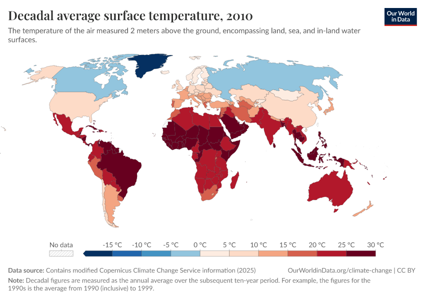 “Data Page: Decadal average surface temperature”, part of the following publication: Hannah Ritchie, Pablo Rosado, and Veronika Samborska (2024) - “Climate Change”. Data adapted from Contains modified Copernicus Climate Change Service information. Retrieved from https://bespoke-income-plots.owid.pages.dev/grapher/decadal-average-surface-temperature [online resource]How to cite this data