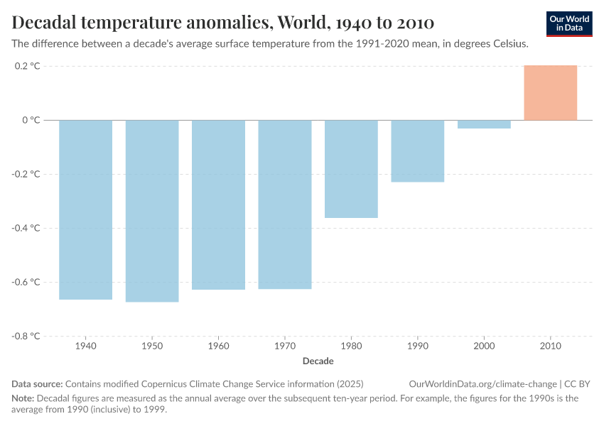 Contains modified Copernicus Climate Change Service information (2025) – with major processing by Our World in Data. “Decadal temperature anomalies” [dataset]. Contains modified Copernicus Climate Change Service information, “ERA5 monthly averaged data on single levels from 1940 to present 2” [original data]. Retrieved March 12, 2026 from https://bespoke-income-plots.owid.pages.dev/grapher/decadal-temperature-anomaly