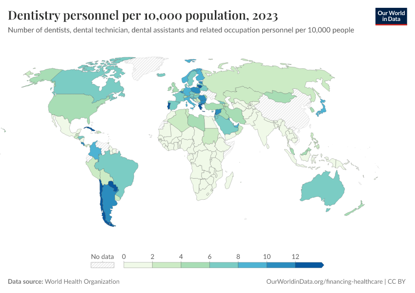 “Data Page: Dentistry personnel per 10,000 population”. Our World in Data (2026). Data adapted from World Health Organization. Retrieved from https://bespoke-income-plots.owid.pages.dev/grapher/dentistry-personnel-per-1000 [online resource]How to cite this data