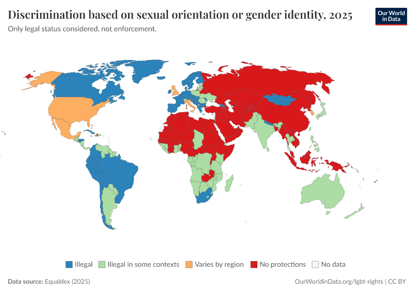 Equaldex (2025) – with major processing by Our World in Data. “Discrimination based on sexual orientation or gender identity” [dataset]. Equaldex, “Equaldex” [original data]. Retrieved March 12, 2026 from https://bespoke-income-plots.owid.pages.dev/grapher/discrimination-lgbt-equaldex