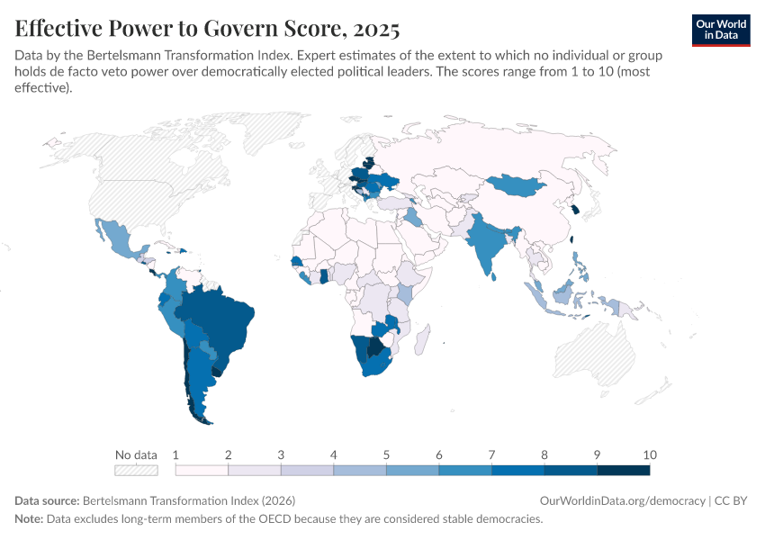 “Data Page: Effective Power to Govern Score”, part of the following publication: Bastian Herre, Lucas Rodés-Guirao, and Esteban Ortiz-Ospina (2013) - “Democracy”. Data adapted from Bertelsmann Transformation Index. Retrieved from https://bespoke-income-plots.owid.pages.dev/grapher/effective-power-to-govern-score-bti [online resource]How to cite this data