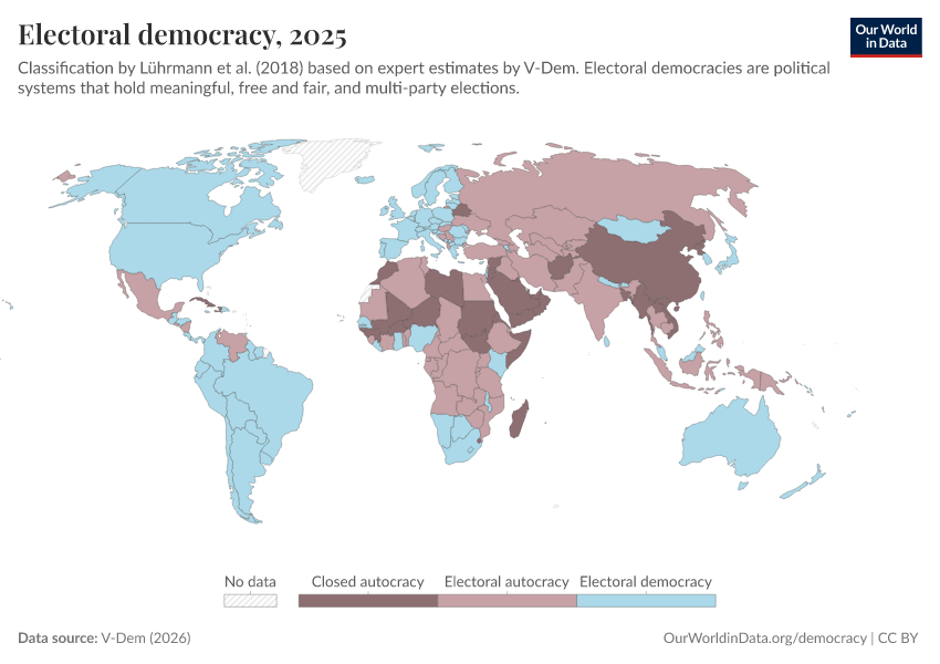 V-Dem (2025) – processed by Our World in Data. “Political regime – reduced” [dataset]. V-Dem, “Democracy report v15” [original data]. Retrieved March 12, 2026 from https://bespoke-income-plots.owid.pages.dev/grapher/electoral-democracy-row