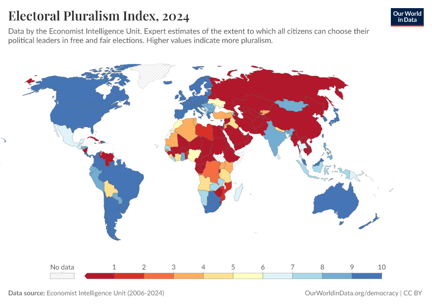 “Data Page: Electoral Pluralism Index”, part of the following publication: Bastian Herre, Lucas Rodés-Guirao, and Esteban Ortiz-Ospina (2013) - “Democracy”. Data adapted from Economist Intelligence Unit, Gapminder, Various sources. Retrieved from https://bespoke-income-plots.owid.pages.dev/grapher/electoral-pluralism-index-eiu [online resource]How to cite this data