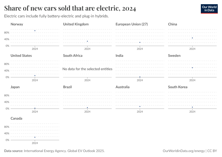 “Data Page: Share of new cars sold that are electric”. Our World in Data (2026). Data adapted from International Energy Agency. Global EV Outlook 2025.. Retrieved from https://bespoke-income-plots.owid.pages.dev/grapher/electric-car-sales-share [online resource]