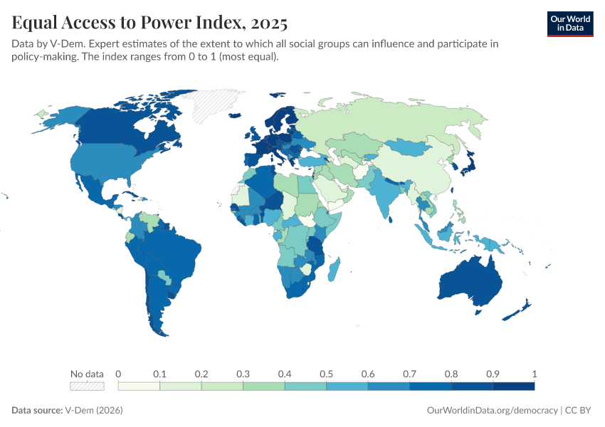 “Data Page: Equal access to power index”, part of the following publication: Bastian Herre, Lucas Rodés-Guirao, and Esteban Ortiz-Ospina (2013) - “Democracy”. Data adapted from V-Dem. Retrieved from https://bespoke-income-plots.owid.pages.dev/grapher/equal-access-to-power-index [online resource]How to cite this data