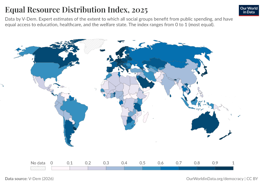 V-Dem (2025) – processed by Our World in Data. “Equal resource distribution index – V-Dem” [dataset]. V-Dem, “Democracy report v15” [original data]. Retrieved March 12, 2026 from https://bespoke-income-plots.owid.pages.dev/grapher/equal-resource-distribution-index