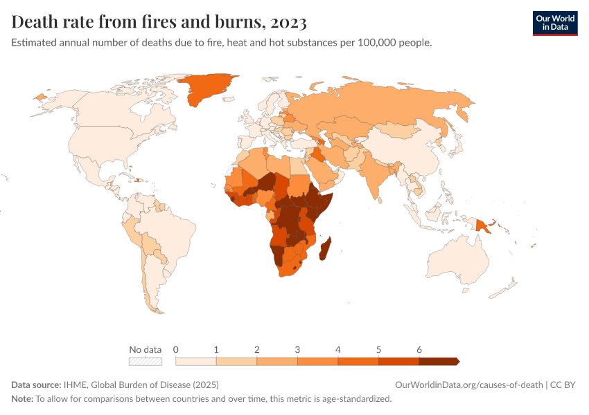 IHME, Global Burden of Disease (2025) – with major processing by Our World in Data. “Death rate from fires and burns” [dataset]. IHME, Global Burden of Disease, “Global Burden of Disease - Deaths” [original data]. Retrieved March 12, 2026 from https://bespoke-income-plots.owid.pages.dev/grapher/fire-death-rates