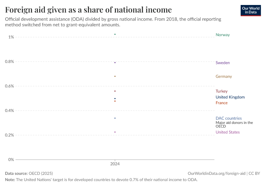 “Data Page: Foreign aid given as a share of national income”, part of the following publication: Bastian Herre, Pablo Arriagada, Simon van Teutem, and Hannah Ritchie (2024) - “Foreign Aid”. Data adapted from OECD. Retrieved from https://bespoke-income-plots.owid.pages.dev/grapher/foreign-aid-given-as-a-share-of-national-income [online resource]