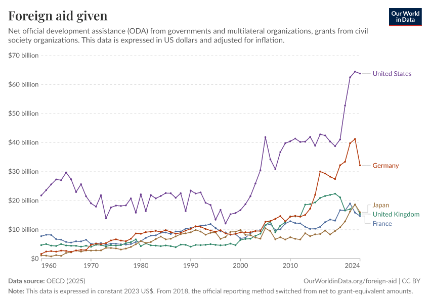 OECD (2025) – with major processing by Our World in Data. “Foreign aid given – Net disbursements” [dataset]. OECD, “OECD Official Development Assistance (ODA) - DAC1: Flows by provider (ODA+OOF+Private)”; OECD, “OECD Official Development Assistance (ODA) - DAC2A: Aid (ODA) disbursements to countries and regions” [original data]. Retrieved March 12, 2026 from https://bespoke-income-plots.owid.pages.dev/grapher/foreign-aid-given-net