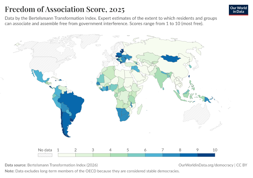 “Data Page: Freedom of Association Score”, part of the following publication: Bastian Herre, Lucas Rodés-Guirao, and Esteban Ortiz-Ospina (2013) - “Democracy”. Data adapted from Bertelsmann Transformation Index. Retrieved from https://bespoke-income-plots.owid.pages.dev/grapher/freedom-of-association-score-bti [online resource]How to cite this data
