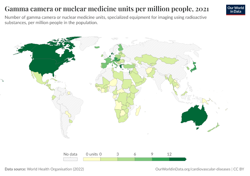“Data Page: Gamma camera or nuclear medicine units per million people”, part of the following publication: Saloni Dattani, Veronika Samborska, Hannah Ritchie, and Max Roser (2023) - “Cardiovascular Diseases”. Data adapted from World Health Organisation. Retrieved from https://bespoke-income-plots.owid.pages.dev/grapher/gamma-camera-or-nuclear-medicine-availability [online resource]How to cite this data