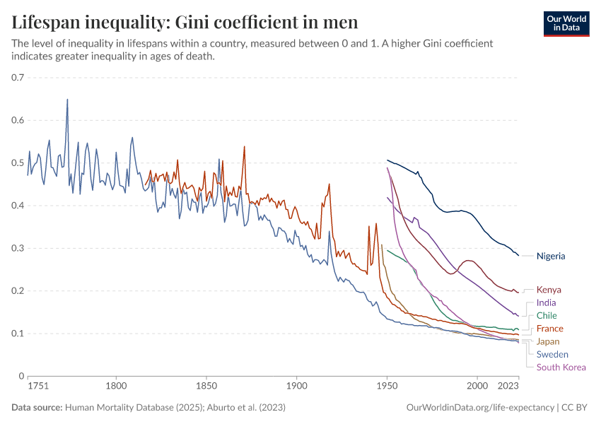 “Data Page: Lifespan inequality: Gini coefficient in men”, part of the following publication: Saloni Dattani, Lucas Rodés-Guirao, Hannah Ritchie, Esteban Ortiz-Ospina, and Max Roser (2023) - “Life Expectancy”. Data adapted from Human Mortality Database, United Nations. Retrieved from https://bespoke-income-plots.owid.pages.dev/grapher/gini-coefficient-of-lifespan-inequality-in-males [online resource]How to cite this data