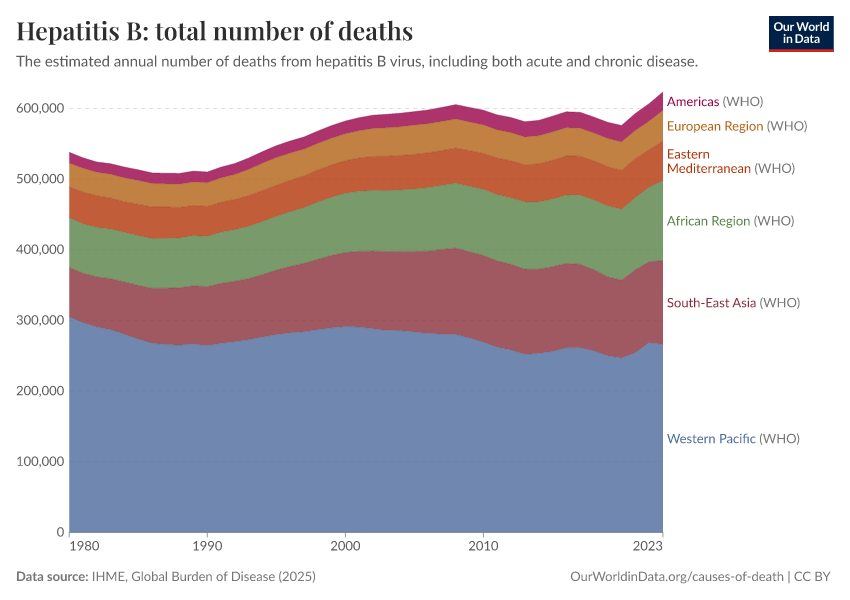 IHME, Global Burden of Disease (2025) – with major processing by Our World in Data. “Hepatitis B: total number of deaths” [dataset]. IHME, Global Burden of Disease, “Global Burden of Disease - Deaths” [original data]. Retrieved March 12, 2026 from https://bespoke-income-plots.owid.pages.dev/grapher/hepatitis-b-number-of-deaths