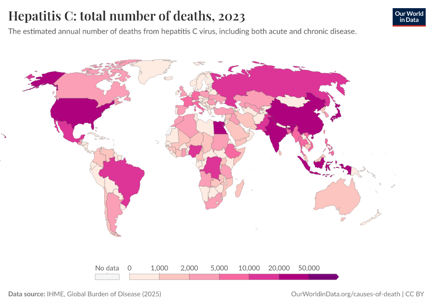 “Data Page: Hepatitis C: total number of deaths”, part of the following publication: Esteban Ortiz-Ospina and Max Roser (2016) - “Global Health”. Data adapted from IHME, Global Burden of Disease. Retrieved from https://bespoke-income-plots.owid.pages.dev/grapher/hepatitis-c-number-of-deaths [online resource]How to cite this data