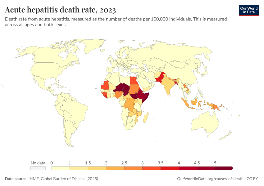 “Data Page: Acute hepatitis death rate”, part of the following publication: Esteban Ortiz-Ospina and Max Roser (2016) - “Global Health”. Data adapted from IHME, Global Burden of Disease. Retrieved from https://bespoke-income-plots.owid.pages.dev/grapher/hepatitis-death-rate [online resource]How to cite this data