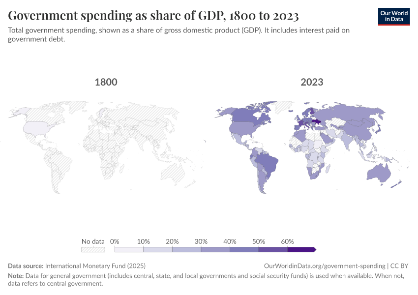 International Monetary Fund (2025) – with minor processing by Our World in Data. “Government spending as share of GDP” [dataset]. International Monetary Fund, “Public Finances in Modern History” [original data]. Retrieved March 12, 2026 from https://bespoke-income-plots.owid.pages.dev/grapher/historical-gov-spending-gdp