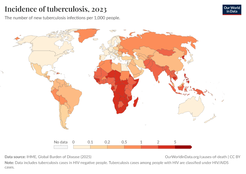 IHME, Global Burden of Disease (2025) – with major processing by Our World in Data. “Incidence of tuberculosis” [dataset]. IHME, Global Burden of Disease, “Global Burden of Disease - Prevalence and Incidence” [original data]. Retrieved March 12, 2026 from https://bespoke-income-plots.owid.pages.dev/grapher/incidence-of-tuberculosis