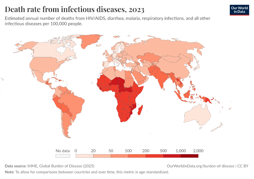 IHME, Global Burden of Disease (2025) – with major processing by Our World in Data. “Death rate from infectious diseases” [dataset]. IHME, Global Burden of Disease, “Global Burden of Disease - Deaths” [original data]. Retrieved March 12, 2026 from https://bespoke-income-plots.owid.pages.dev/grapher/infectious-disease-death-rates