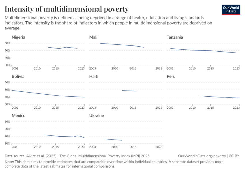 Alkire et al. (2025) - The Global Multidimensional Poverty Index (MPI) 2025 – with minor processing by Our World in Data. “Intensity of multidimensional poverty – Harmonized over time” [dataset]. Alkire et al., “Global Multidimensional Poverty Index (MPI) 2025” [original data]. Retrieved March 12, 2026 from https://bespoke-income-plots.owid.pages.dev/grapher/intensity-of-multidimensional-poverty-hot