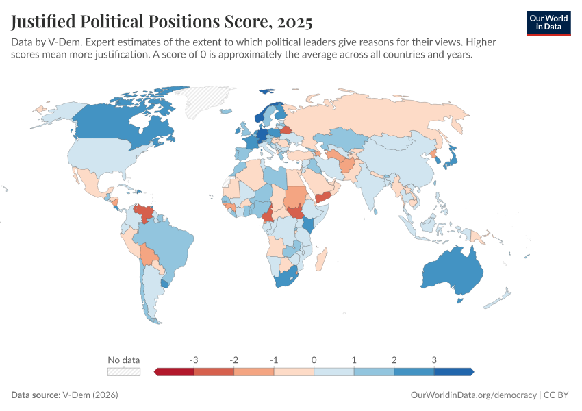 V-Dem (2025) – processed by Our World in Data. “Justified political positions – V-Dem” [dataset]. V-Dem, “Democracy report v15” [original data]. Retrieved March 12, 2026 from https://bespoke-income-plots.owid.pages.dev/grapher/justified-political-positions-score