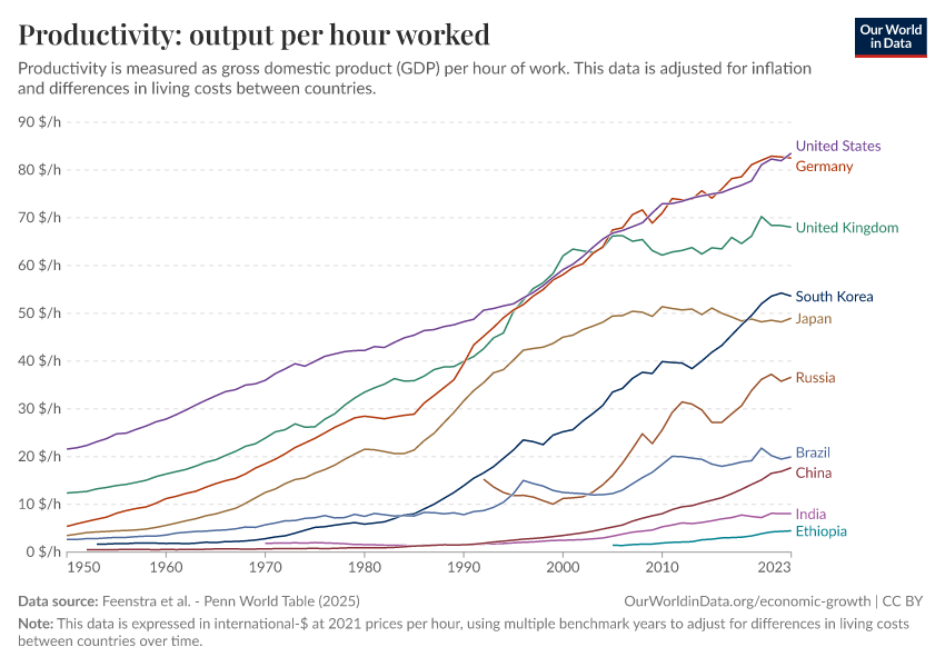 “Data Page: Productivity: output per hour worked”, part of the following publication: Max Roser, Bertha Rohenkohl, Pablo Arriagada, Joe Hasell, Hannah Ritchie, and Esteban Ortiz-Ospina (2023) - “Economic Growth”. Data adapted from Feenstra et al.. Retrieved from https://bespoke-income-plots.owid.pages.dev/grapher/labor-productivity-per-hour-pennworldtable [online resource]How to cite this data