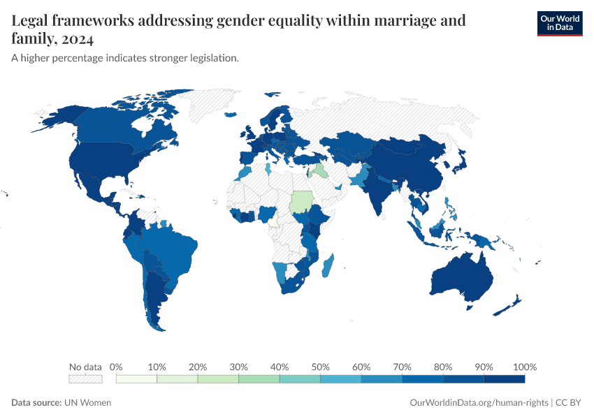 “Data Page: Legal frameworks addressing gender equality within marriage and family”. Our World in Data (2026). Data adapted from UN Women. Retrieved from https://bespoke-income-plots.owid.pages.dev/grapher/legal-frameworks-gender-equality-within-marriage-and-family [online resource]How to cite this data