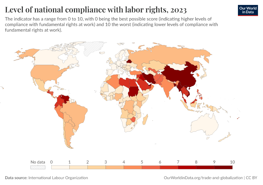 “Data Page: Level of national compliance with labor rights”. Our World in Data (2026). Data adapted from International Labour Organization. Retrieved from https://bespoke-income-plots.owid.pages.dev/grapher/level-of-national-compliance-with-labor-rights [online resource]How to cite this data