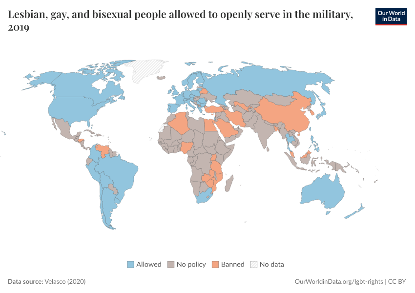 “Data Page: Lesbian, gay, and bisexual people allowed to openly serve in the military”, part of the following publication: Bastian Herre and Pablo Arriagada (2023) - “LGBT+ Rights”. Data adapted from Velasco. Retrieved from https://bespoke-income-plots.owid.pages.dev/grapher/lgb-military-velasco [online resource]How to cite this data